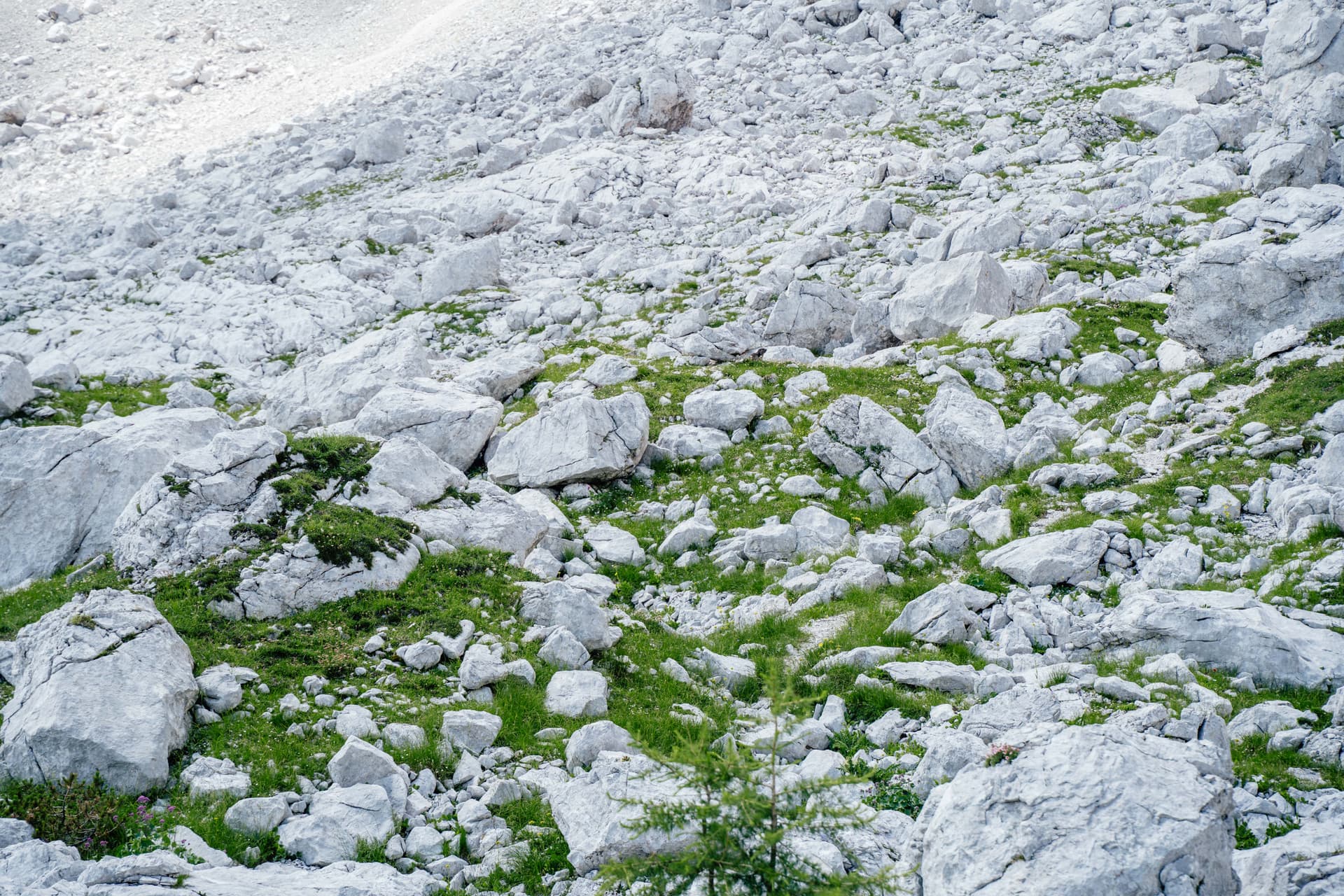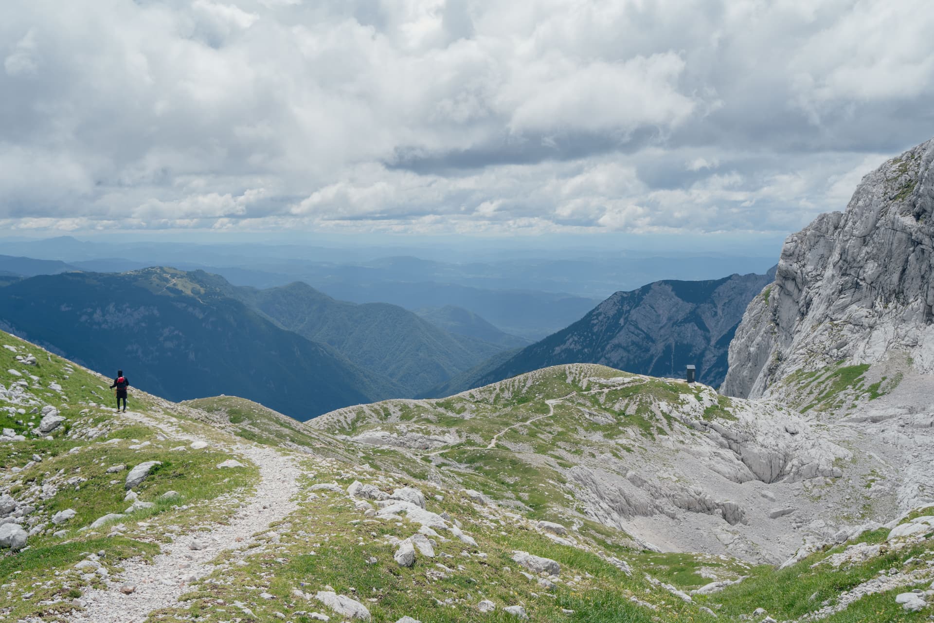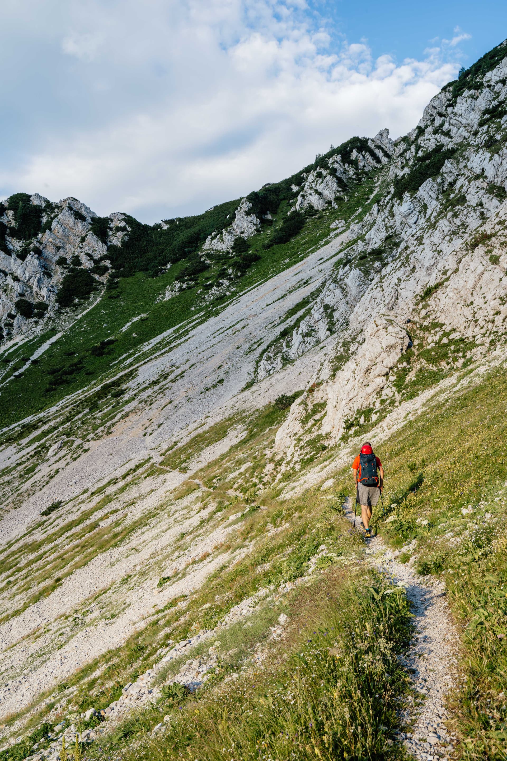 Hier begint het pad echt alpien aan te voelen: scherper kalksteen, steilere lijnen en serieuzer terrein. Wanneer het weer stabiel is, is het ongelooflijk belonend, maar wanneer dat niet het geval is, krimpt de marge voor slordige beslissingen snel, en ik heb deze dagen met het grootste respect gepland. De officiële route is opgebouwd rond het bewegen door de belangrijkste bergblokken van Slovenië, en dit is een van de eerste plaatsen waar je die verschuiving echt voelt.