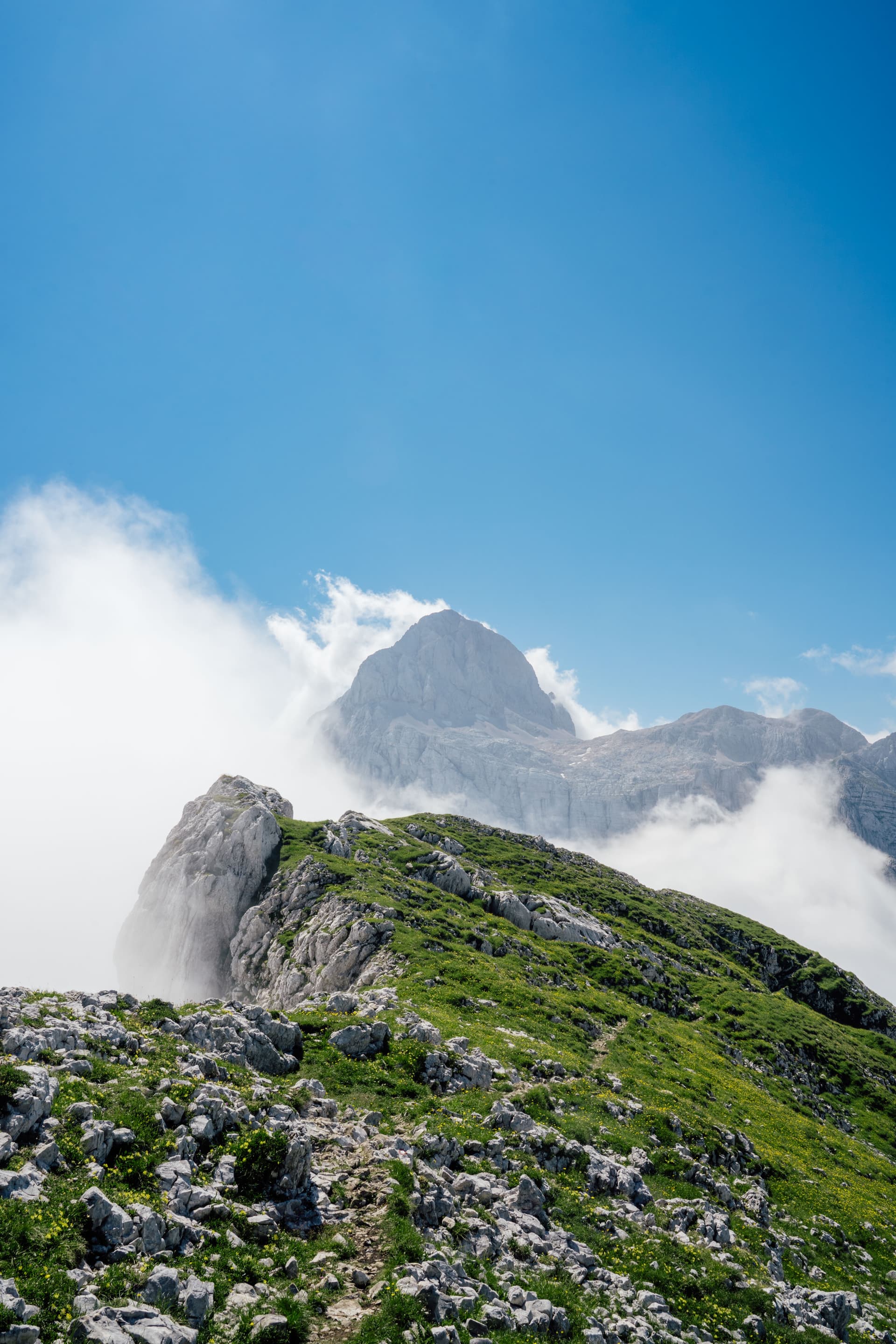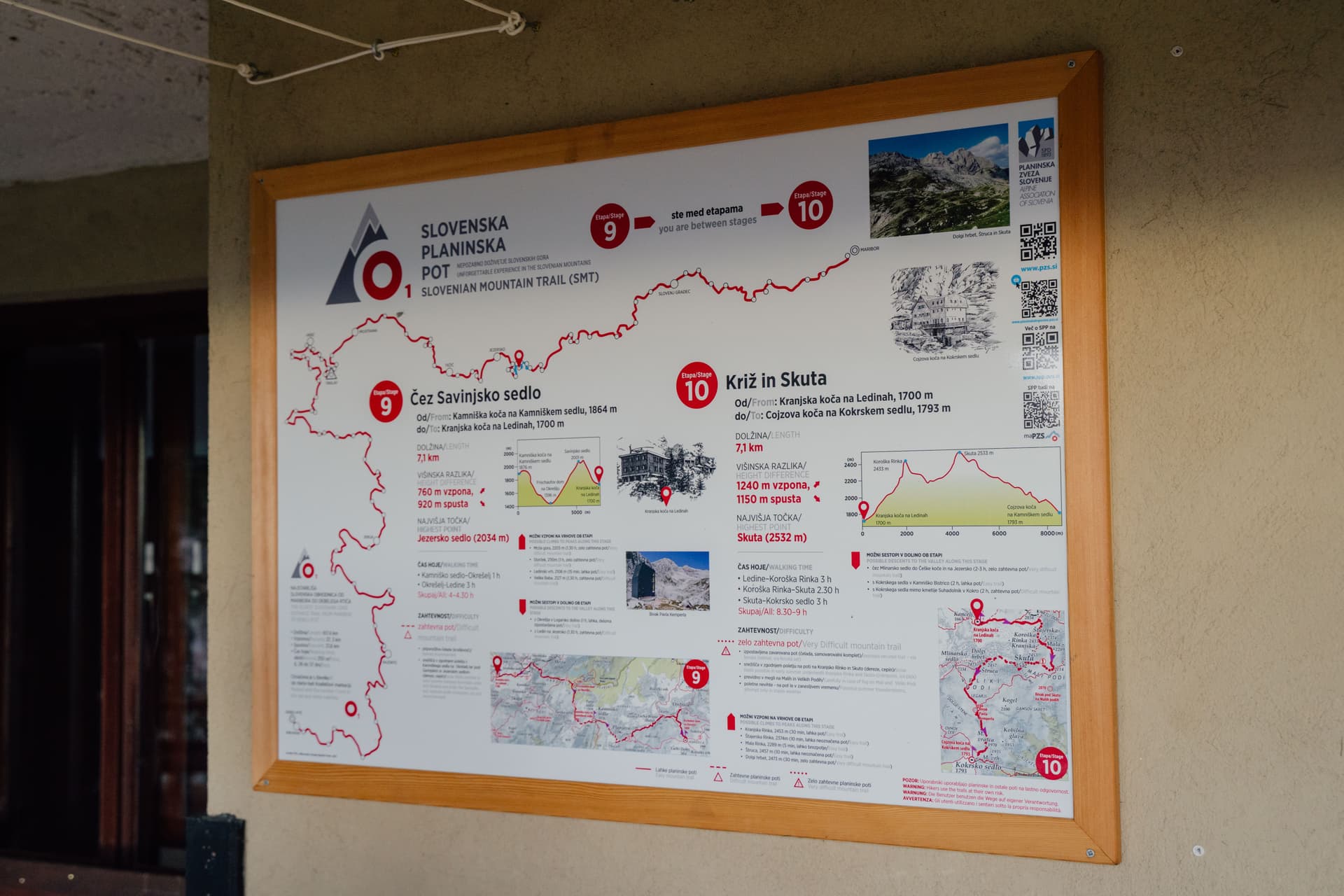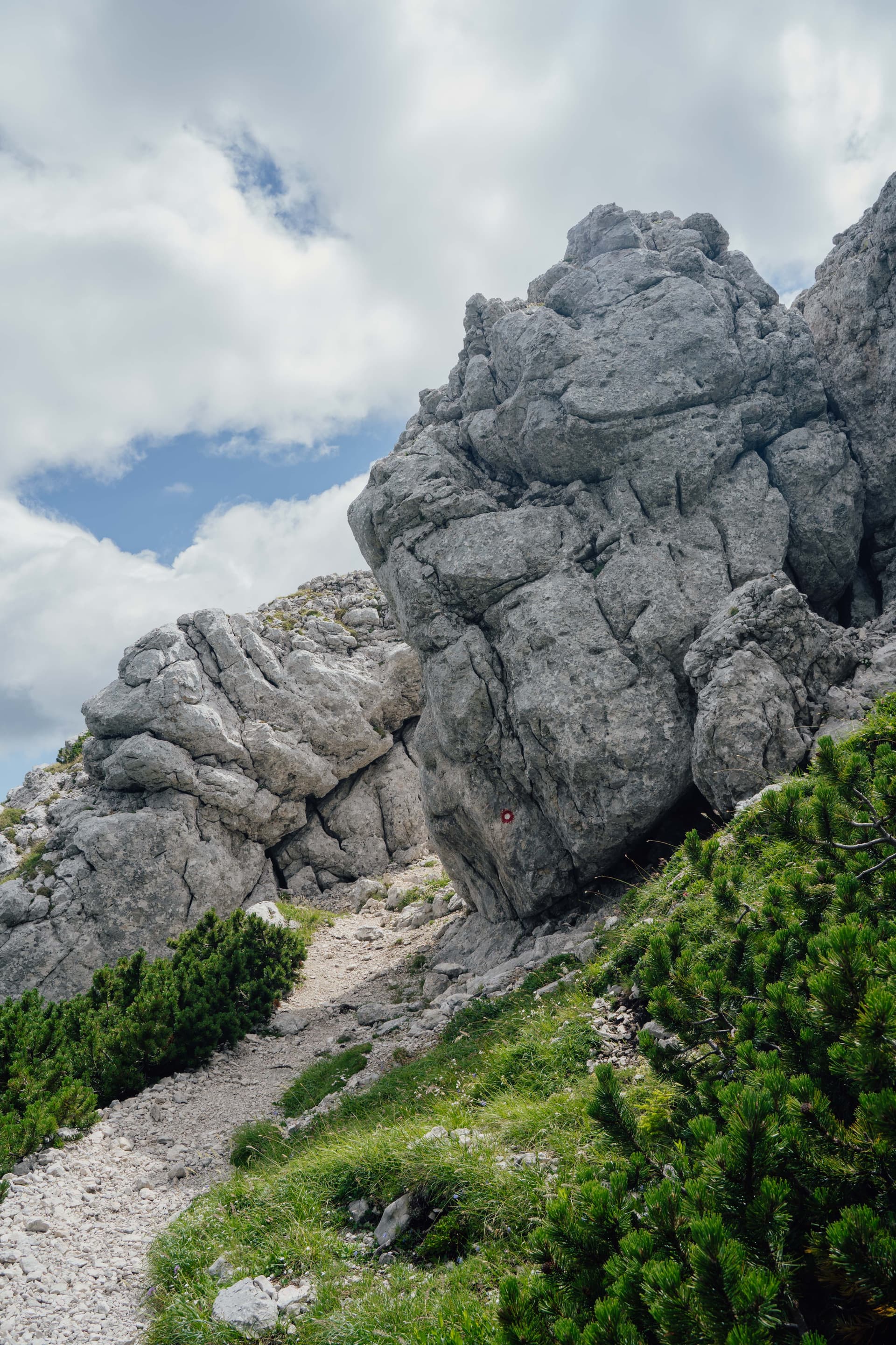 Hier begint het pad echt alpien aan te voelen: scherper kalksteen, steilere lijnen en serieuzer terrein. Wanneer het weer stabiel is, is het ongelooflijk belonend, maar wanneer dat niet het geval is, krimpt de marge voor slordige beslissingen snel, en ik heb deze dagen met het grootste respect gepland. De officiële route is opgebouwd rond het bewegen door de belangrijkste bergblokken van Slovenië, en dit is een van de eerste plaatsen waar je die verschuiving echt voelt.
